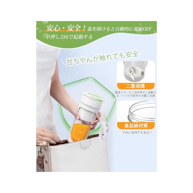 【安心のダブルセーフティ設計】ミキサーは二重安全システムを採用。誤って1回タップしても作動せず、蓋がしっかり閉まっていない状態では起動しない構造です。けがのリスクを徹底的に回避し、安全にご使用いただけます。BPAフリーの食品グレード素材を使用しており、毎日安心してお使いいただけます。