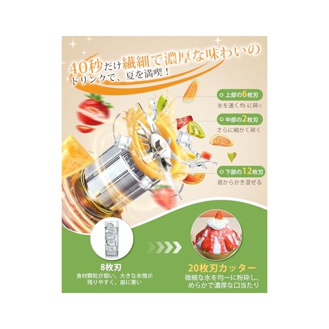【超強20枚刃・氷も砕けるパワフル設計】スムージーミキサーは304ステンレス製の20枚刃と、7.4Vのデュアルモーターを搭載。1分間に約22000回転のハイスピードで、繊維質の多い野菜や硬い果物もスピーディーになめらかなスムージーに。氷も一気に粉砕できるので、ひんやりドリンクもお手の物。忙しい朝でも手軽に栄養チャージ!