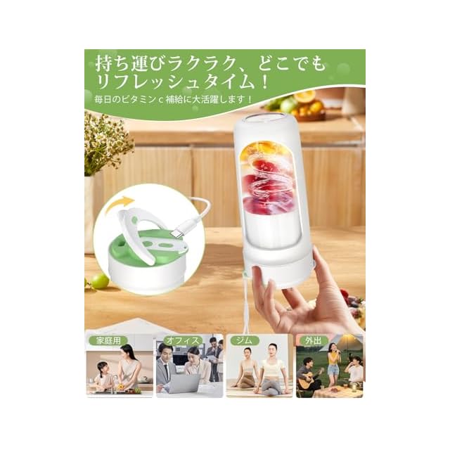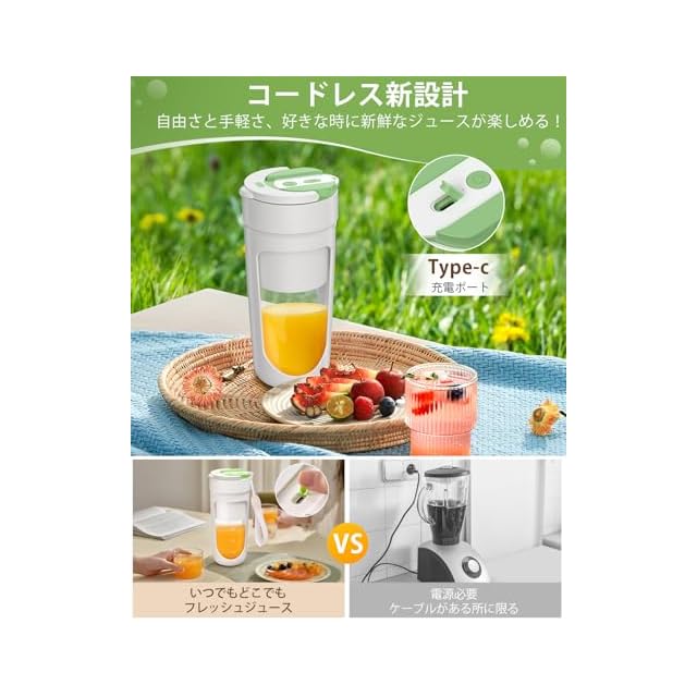 【コードレスミキサー・使いやすさも抜群】ジューサー ミキサーは2回早押して起動できる簡単操作。自動洗浄機能付きでお手入れも楽々。大容量3000mAhバッテリーを内蔵し、約3-4時間でフル充電可能。1回の充電で最大約15-20杯のジュースが作れます。独自の飲み口設計により、コップに注がずそのまま飲めるのも嬉しいポイント。ストラップ付きで、340mlのコンパクトサイズだから家・職場・ジム・旅行先でも大活躍。