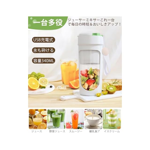 Aliliy ジューサー ミキサー 小型 ジューサー スムージー 氷も砕ける 充電式 340ML 一台多役 一人用 お手入れ簡単 持ち運びやすい 野菜 果物 ビタミン 離乳食 健康ダイエット Type-C充電 アウトドア 旅行 出張 オフィス 日本語取扱説明書