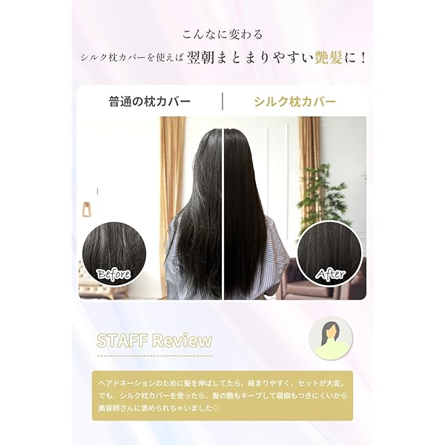 【美髪効果・睡眠中のヘアケア】シルク100%の枕カバーで、シルクに含まれるタンパク質は、枝毛・縮毛・曲がり・乾燥を最小限に抑え、髪と髪の摩擦を平均45%減らす効果があります。シルク枕カバーは長く使っていくうちに、髪が段々柔らかく滑らかになって光沢がでてきたりと髪質改善を実感できます。髪のキューティクルを守り、つや髪を喚起するだけでなく、頭皮と顔面の皮膚環境を整えることができ、睡眠中のビューティーグッズとして重宝されています。