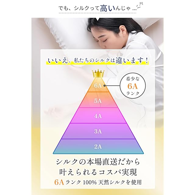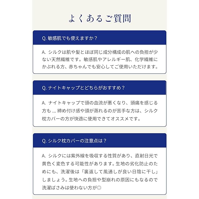 【夏も冬も快適なシルクで安眠】 シルクの通気性、吸湿性は綿の1.5倍!汗をしっかり吸って外に出し、熱も発散するので、お肌も清潔、安眠もサポート!夏は涼しく、冬は暖かく年中快適! 天然繊維だから静電気が起こりにくい、肌触りがよく気持ちいい。 また、シルクの繊維は空気を多く含むことができるため、就寝中の髪や地肌を冷えから守り、夏涼しく冬暖か。年中快適!