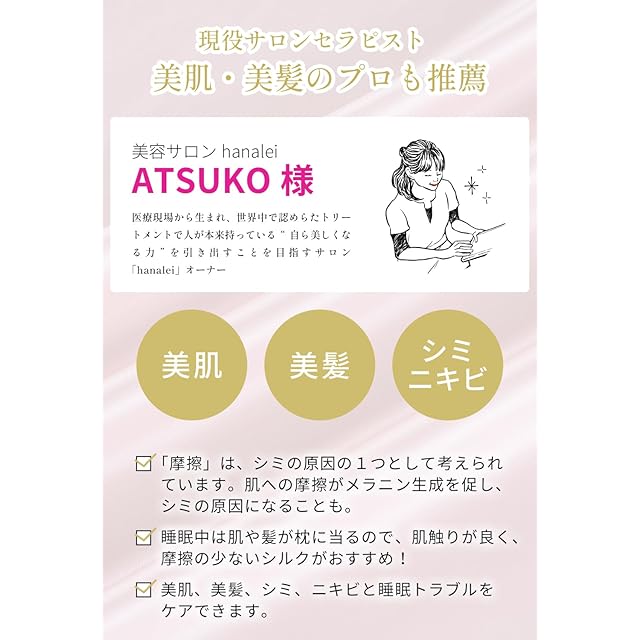 【美髪効果・睡眠中のヘアケアに】 シルクは人の肌に一番近い繊維!人肌に近いアミノ酸成分・たんぱく質を含んでいるから、肌や髪に優しい。 さらに!天然の保湿成分を含んでいて、お肌も髪も乾燥レス!保湿効果で髪や肌がしっとり! 柔らか滑らかな、繊細な繊維のため、摩擦も少く、肌の摩擦・髪ダメージや絡まりを軽減。枝毛・切れ毛が気になる方にも!