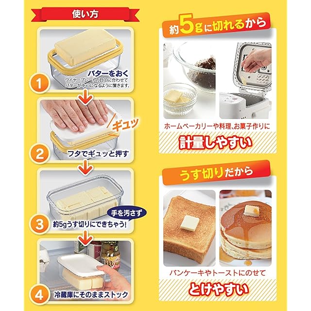 ギュッと一押しで、バターを使いやすい約5gの薄切りに簡単カット冷蔵庫にそのまま保存できる
