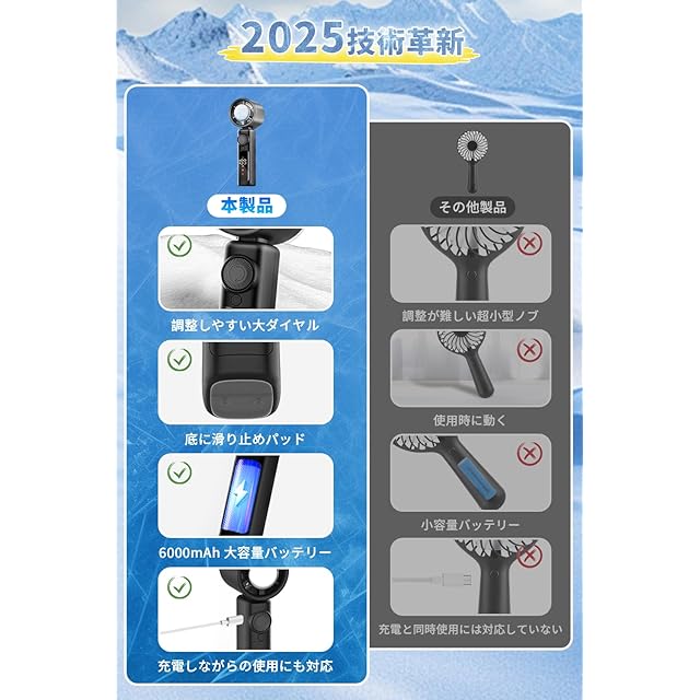 【『強い風』と『優しい風』を両立した手持ち扇風機】当社の手持ち扇風機は、7枚羽根の高密度デザインを採用。強力な風力を生み出すだけでなく、風が均一に分散されるため、肌に当たる風が驚くほどやわらか、デリケートなお子様や敏感肌の方にも安心。従来の扇風機のような『ビリビリした痛み』や『局部の冷えすぎ』を防ぎ、オフィスや外出先でも長時間快適にご利用いただけます。