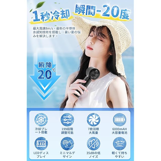 【炎暑対策・2025技術革新・ -25℃瞬間冷却】VORAGA ハンディファン 携帯扇風機 冷却プレート搭載 手持ち扇風機 6000mAh 大容量 長時間駆動可能 強風 静音 LED液晶表示 199段階風量調整 Type-C充電式 ストラップ付属 日本語取扱説明書付き 通勤 通学 アウトドア キャンプ 暑さ対策 熱中症対策 (ブラック)