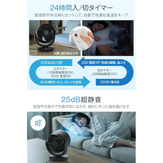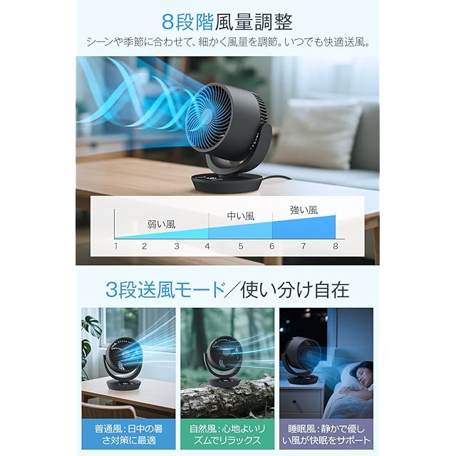 【高性能DCモーター搭載!パワフル送風×25dB超静音で快適な毎日を】パワーと静音性を両立したDCモーターを採用し、最大風量でも静かさはわずか25dB。睡眠中や仕事中でも風の音が気にならず、集中力や眠りを妨げません。3つの風モード(通常・自然・おやすみ)と8段階の風量調節で、暑さ対策はもちろん、冷えすぎ防止にも◎。必要なときに、必要なだけの風をあなたのそばに。