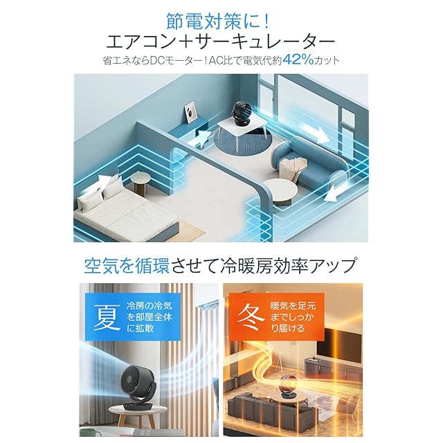 【季節を問わず大活躍!換気・除湿・衣類乾燥までこれ1台】冷房の冷気を循環させて夏の節電対策に、暖房の暖気を足元まで届けて冬の室温均一化に。さらに、梅雨時の部屋干しや衣類乾燥にも最適で、洗濯物が早く乾き、湿気・カビ対策にも◎。春や秋は窓からの風を循環させ、換気やウイルス対策にも活用可能。季節ごとに使い分けられる、まさに「一家に一台」の多機能サーキュレーターです。