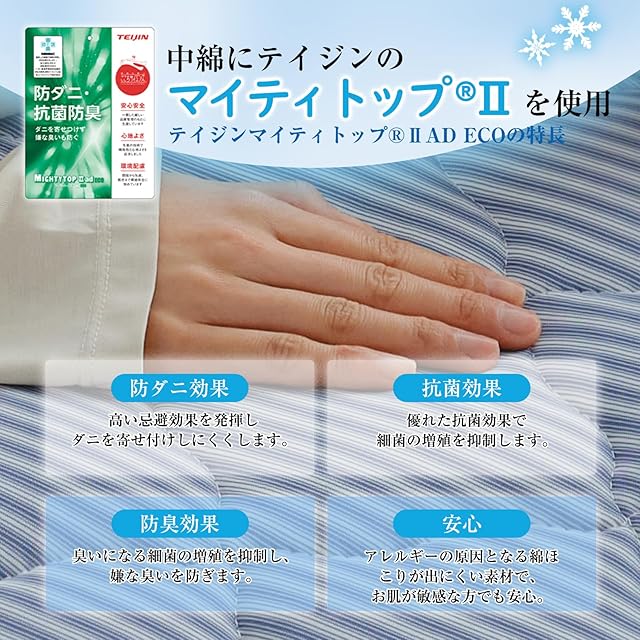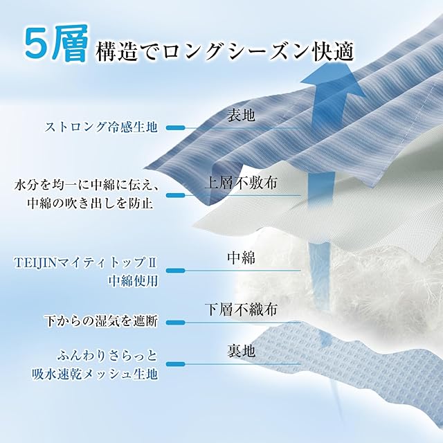 【中綿にTEIJINのマイティトップⅡを使用】詰め物にもこだわり、厚みのあるクッション性の高いパッドにお仕立て。冷たさだけでなく、寝心地にもこだわりたい方におススメです。なかわたに、防ダニ・抗菌防臭性に優れたTEIJIN(帝人)のマイティトップⅡ(R)ECOを使用。ニオイのもとになる菌の繁殖を抑え、頻繁に洗えなくても、毎日清潔に使える心強い味方です。