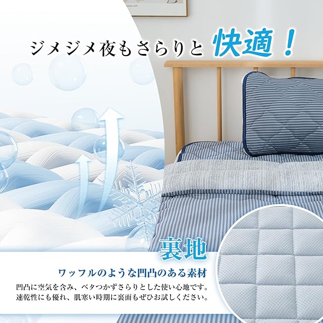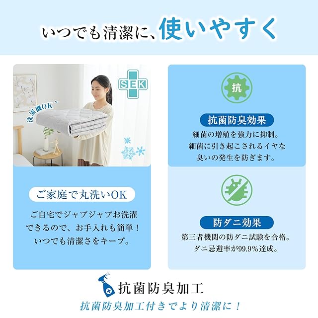 【着脱簡単&洗濯機で丸洗いOK】取り外しが簡単な四隅ゴム付でズレにくく取付も簡単にできます。洗濯機で丸洗いできて、清潔に保てる敷きパッドです。汗をかいたり活れやにおいが気になったりした場合でも丸洗いできるのでお手入れ簡単です。中材には、ポリエステルわたを使用しており、乾きも早く夏場に大変重宝します。