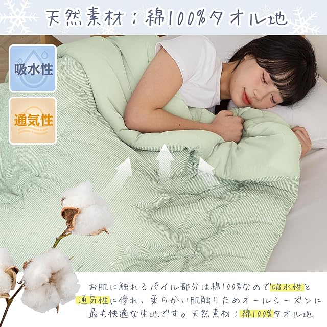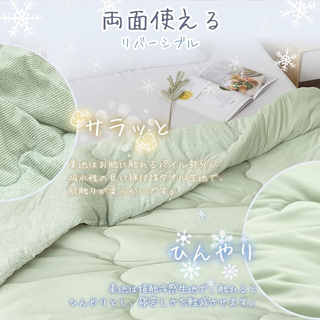 【リバーシブル・オールシーズン適用】表地は接触冷感生地で、触れるとひんやりとし、寝苦しさを軽減させます。裏地は柔らかく着心地のタオル生地で、夏が終わっても全く心配なく、反転しても使いやすい商品。通気性に優れた生地を使用しているので、ガス交換や水分蒸発がより迅速になります。四季を通して使用しても蒸れることなく、とても爽やかです。季節を選ばないオールシーズン使用可能で、春・秋・冬も完全OK!