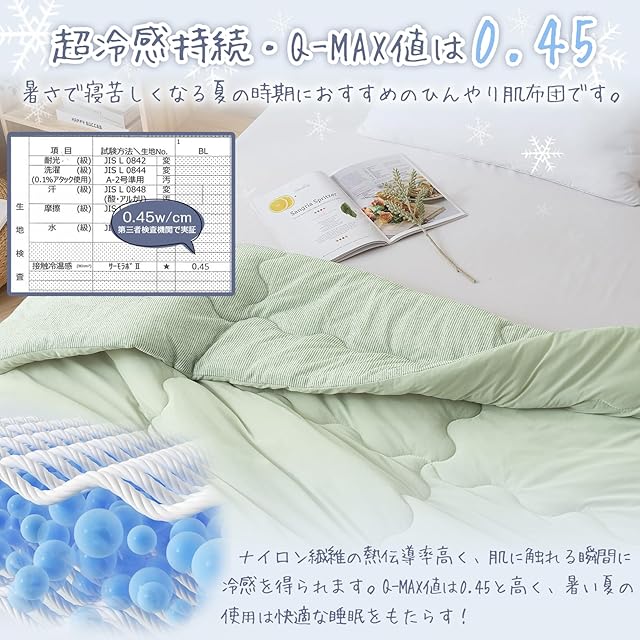 【超冷感持続・Q-MAX値は0.45】暑さで寝苦しくなる夏の時期におすすめのひんやり肌布団です。熱伝導により触れた部分がひんやり感じる接触冷感素材です。表地はQ-MAX値0.45のコンタクトクール生地を使用しており、肌に触れるとすぐに涼しくなり、夏でも快適に使用できる。冷房なしの時にすごく役立ち、エコで快適な睡眠をゲット!冷房や扇風機などと一緒に使用してひんやり感がアップし、超おすすめですので、ぜひ試してみてください。