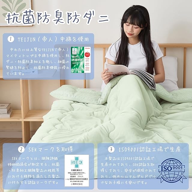 【帝人中綿を使用&SEKマークを取得:抗菌防臭防ダニ】 中わたには上質なTEIJIN(帝人)マイティトップⅡ中綿を使用し、防ダニ・防菌防臭加工を施し、細菌の繁殖を防止し、抗菌防臭機能に優れています。機能が持続し、何度も洗濯した後の効果は依然として新しいものと同じです。SEKマークとは、繊維評価技術協議会が制定する、抗菌・防臭加工繊維製品の性能等における規格を満たした製品に付与する認証マーク。本製品はISO9001認証工場で生産されており、SEK認証を取得しており、安全が保障されており、低ホルムアルデヒドで小さなお子様にも安心です。