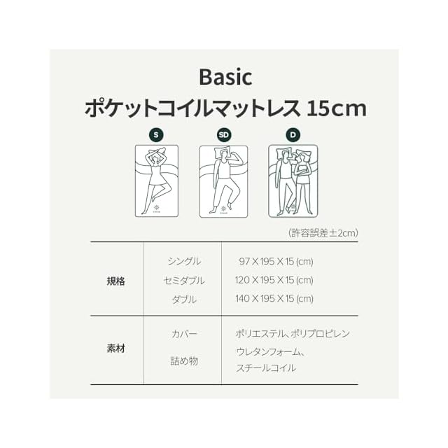 [かたさ:ふつう] 商品サイズ:幅97cm×奥行195cm×高15cm、重量:15.77kg、かたさ(N)/コイル:上層:67N(やわらかめ) 下層:コイル数450個、線径2.0mm、並行配列(ふつう)、完成品(開梱のみ)※特許取得の圧縮技術によりコンパクト梱包でお届けいたします。