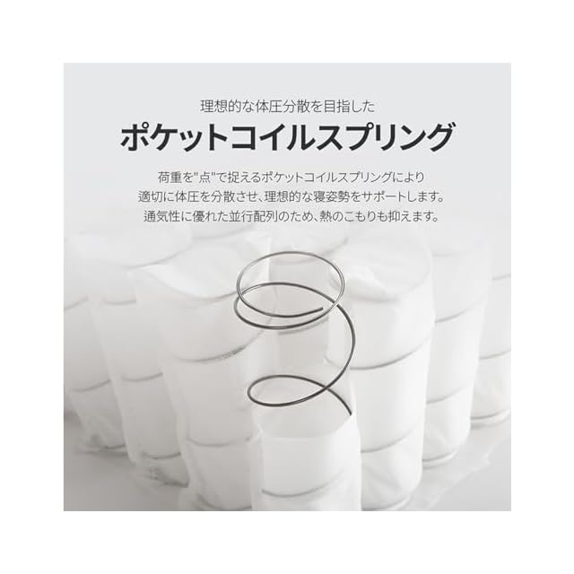 【ポケットコイルのフィット感】 1個1個の独立した点で支えるコイルが、睡眠中の体のラインにフィット。バランスよく体圧を分散し寝返りがしやすくなり、振動も抑えるため、快適な睡眠をサポートします。