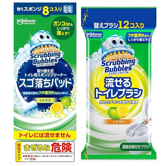 【.co.jp 限定】スクラビングバブル (Scrubbing Bubbles) 流せるトイレブラシ付け替え用12個+取り換え式スポンジクリーナースゴ落ちパッド 付け替え用8個セット トイレ洗剤 トイレ掃除 ブラシ 使い捨て 洗剤 まとめ買い