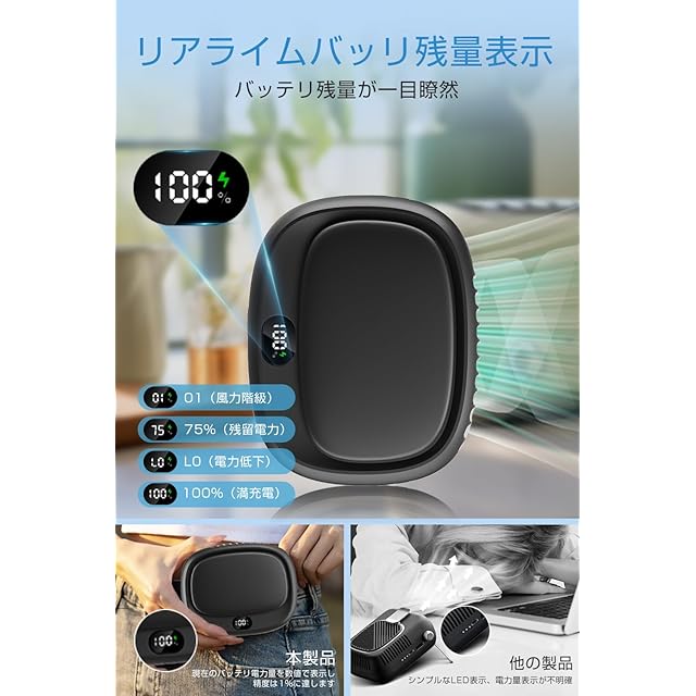 ✅【一目でわかる精細液晶LEDディスプレイ·腰掛けクーラー】従来型より、当社の腰掛けクーラーが一目でわかるLEDディスプレイ付きので、ファンの変速状態と電力残量が表示されるため、いつでもお好みの風速に切り替えることができ、タイムリーな充電情報を把握することができます。当社の携帯扇風機は、6000mAh大容量バッテリー、LEDディスプレイ、Type-C急速充電、4段階風量調節、軽量で持ち運びが簡単という利点を組み合わせており、今までのない使用体験を提供します。