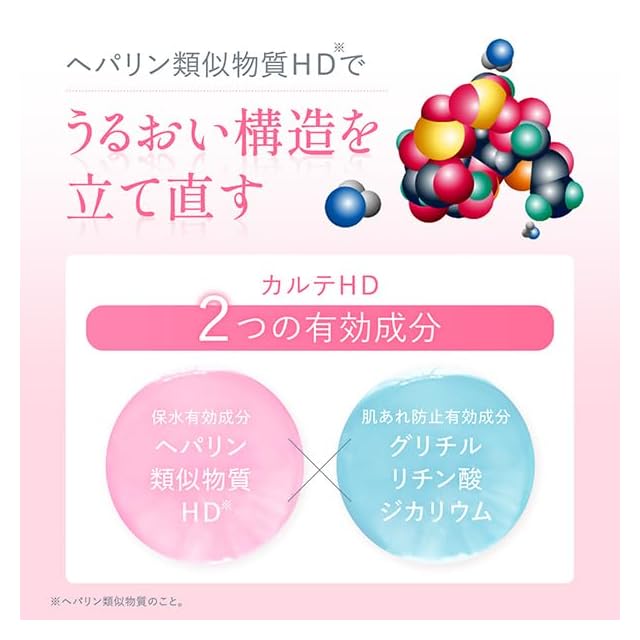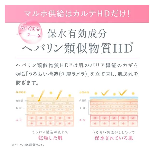 【うるおい構造にアプローチする“ヘパリン類似物質HD ”配合】肌の保水に大切なうるおい構造(角層ラメラ)にはたらきかける保水有効成分。 肌のうるおいを高めて、肌あれを防ぎます。※ヘパリン類似物質HDはヘパリン類似物質のことです。