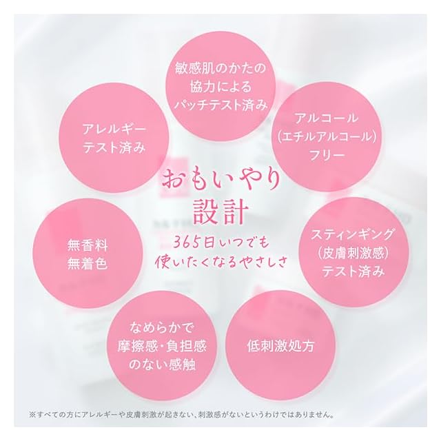 【あなたの肌へのおもいやり】アレルギーテスト、敏感肌の方の協力によるパッチテスト済み、 スティンギング(皮膚刺激感)テスト済み、ニキビのもとになりにくい処方(ノンコメドジェニックテスト済み)、無香料、無着色、 アルコール(エチルアルコール)フリー、低刺激処方。※すべてのかたにアレルギーや皮膚刺激が起きない、刺激感がない、コメド(ニキビのもと)ができないというわけではありません。