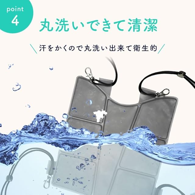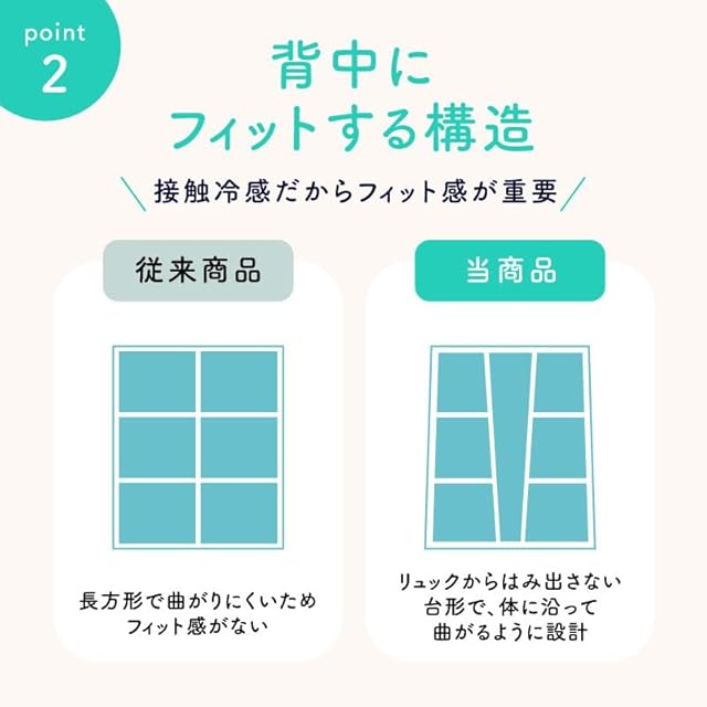 【point②】背中にフィットする構造。触冷感だからフィット感が重要。長方形で曲がりにくいためフィット感がないリュックからはみ出さない台形で、体に沿って曲がるように設計