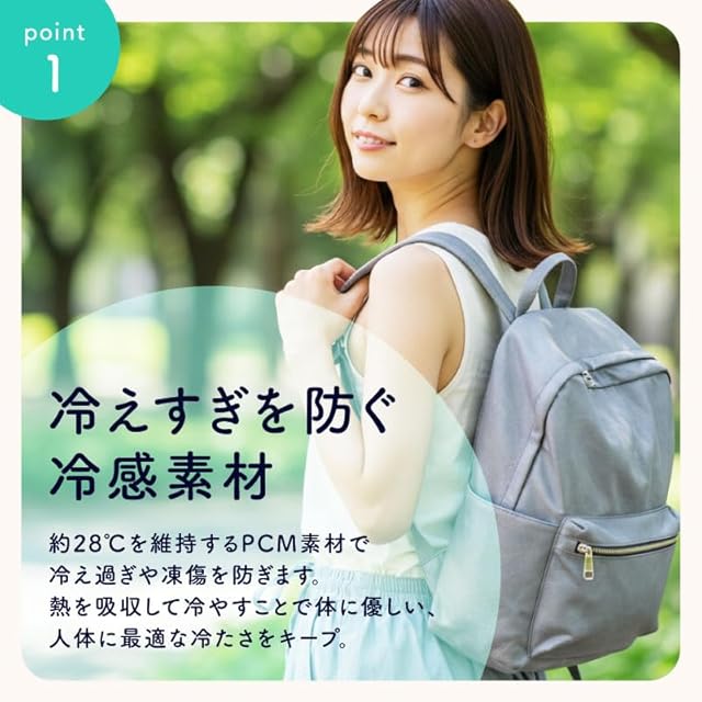 【point①】冷えすぎを防ぐ冷感素材。約28°Cを維持するPCM素材で冷え過ぎや凍傷を防ぎます。熱を吸収して冷やすことで体に優しい、人体に最適な冷たさをキープ