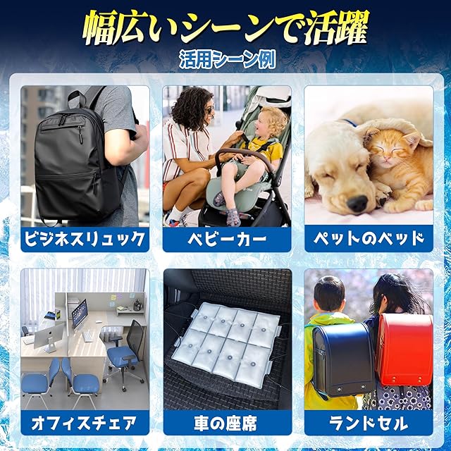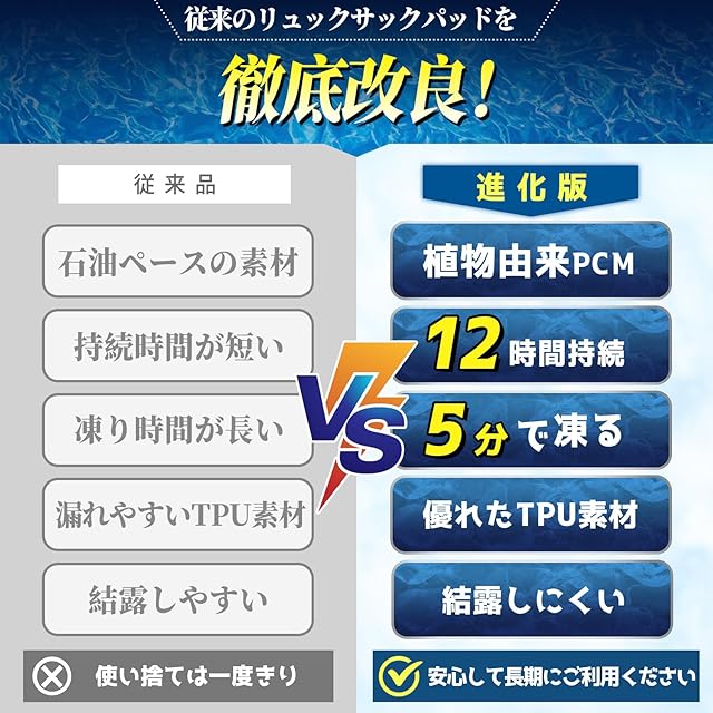 商品特徴:リュック用冷却パッド、縦25・横22(cm)のサイズで、重さ300gです。外側はTPU(熱可塑性ポリウレタン)素材で作られており、中はPCM(オクタデカン)でできています。暑い季節に最適な背中がひんやり快適な商品です。この「溶けない氷」と称される特殊素材は、お客様が快適に夏を過ごすために開発されました。市販のリュックに幅広く適用可能です。熱中症対策としても優れており、快適な着心地を提供します。