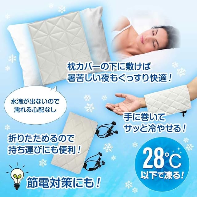 【使い方】本製品は28°C以下の環境になると自然に氷結します。 軟化してきたら、28°C以下の環境に置くことで再度氷結します。 ※外出時は、水道の流水で冷やすのもおすすめです。