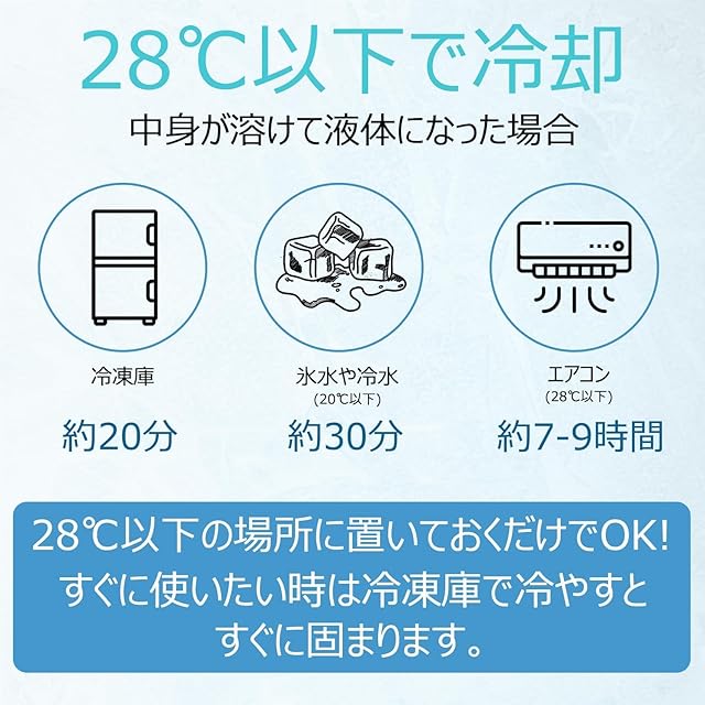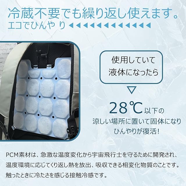 【28度の室内で自然氷結冷蔵庫不要】弊社製品はNASAが開発した最新先端技術のPCM素材を採用しています。PCM素材の特性は凝固するのが早く、融解するのが遅いのが特徴的であり、夏の熱中症対策や暑さ対策に最適です。弊社製品は、よくある市販の18度氷結タイプとは異なり、使用後に室内温度が28度以下であれば、放置するだけで自然に氷結され、冷蔵庫がない環境でも、繰り返して手軽にご使用頂けます。