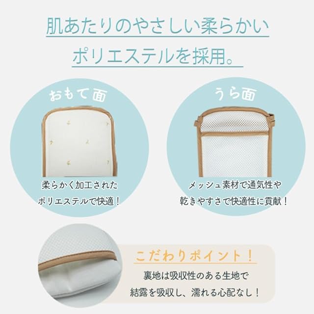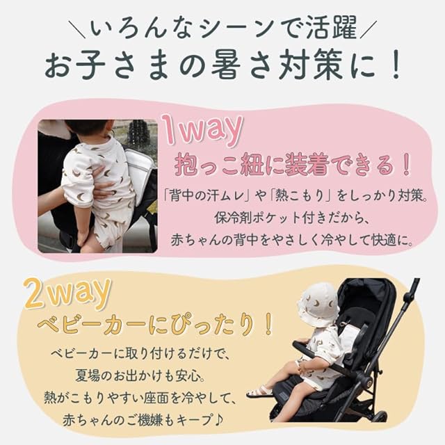 【おすすめポイント】・抱っこ紐・チャイルドシート・ベビーカーに対応・ 繰り返し使える保冷ジェル付き・ ひも付きでズレにくい安心設計・洗濯OK(※保冷剤は取り出してください)・暑さが気になる季節に1つあると大活躍!
