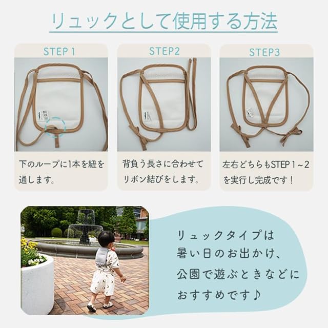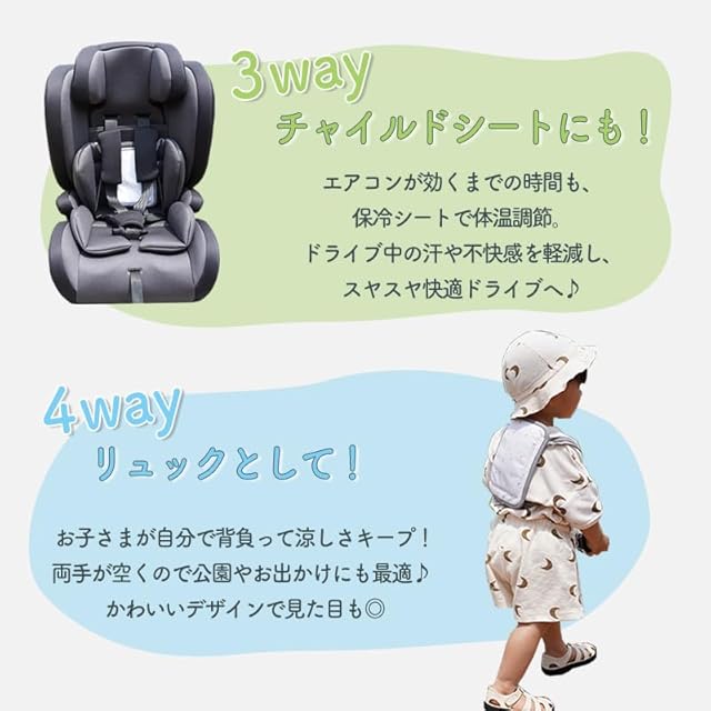 【いろんなシーンで活躍】お子さまの暑さ対策に!≪1way≫抱っこ紐に装着できる !「背中の汗ムレ」 や 「熱こもり」をしっかり対策。 保冷剤ポケット付きだから、赤ちゃんの背中をやさしく冷やして快適に。≪2way≫ベビーカーにぴったり!ベビーカーに取り付けるだけで、夏場のお出かけも安心。熱がこもりやすい座面を冷やして、赤ちゃんのご機嫌もキープ ♪≪3way≫チャイルドシートにも!エアコンが効くまでの時間も、保冷シートで体温調節。ドライブ中の汗や不快感を軽減し、スヤスヤ快適ドライブへ♪≪4way≫リュックとして!お子さまが自分で背負って涼しさキープ! 両手が空くので公園やお出かけにも最適♪ かわいいデザインで見た目も◎