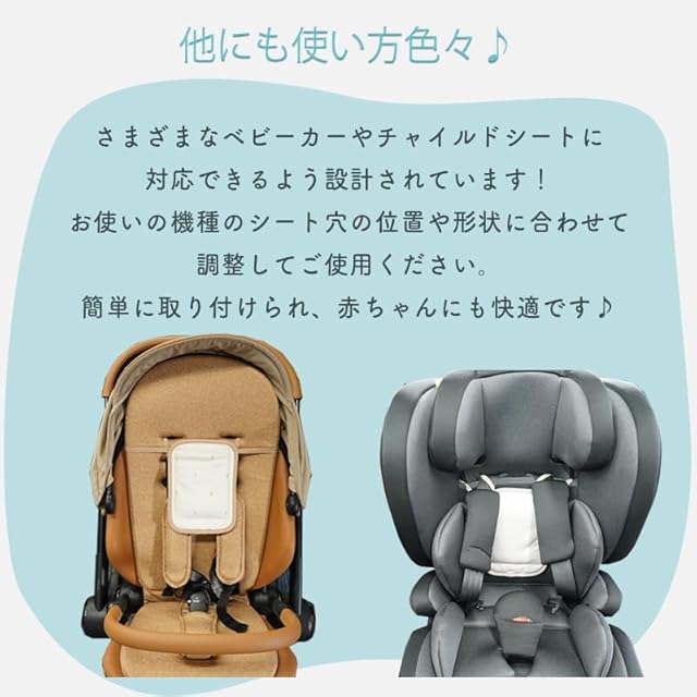 【他にも使い方色々♪】さまざまなベビーカーやチャイルドシートに対応できるよう設計されています!お使いの機種のシート穴の位置や形状に合わせて調整してご使用ください。簡単に取り付けられ、 赤ちゃんにも快適です♪