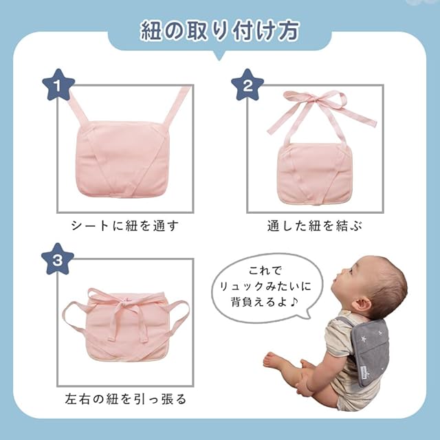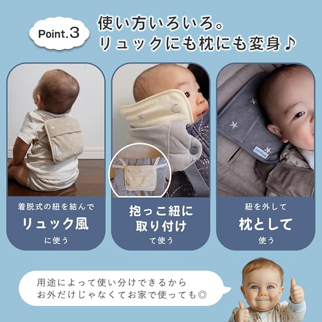 【使い方いろいろ。リュックにも枕にも変身】抱っこ紐に取り付けたり、着脱式の紐でリュック風にしたり、用途によって使い分けできます。紐を外して枕としても◎