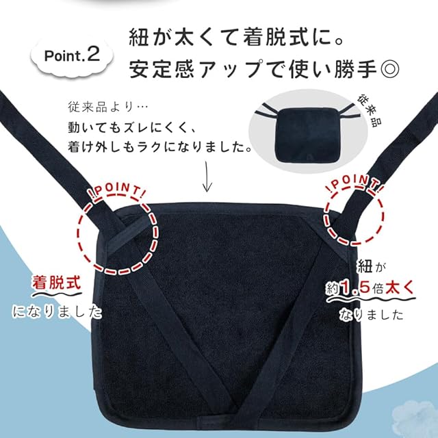 【紐が太くて着脱式に。 安定感アップで使い勝手】紐が従来品より約1.5倍太くなり、着脱式にリニューアル。動いてもズレにくく、着け外しもラクになりました。