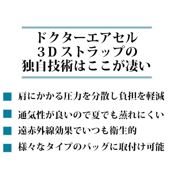 【ドクターエアセル3Dストラップ4つの特徴】 ■通気性が良いので夏でも蒸れにくい ■遠赤外線効果でいつも衛生的 ■様々なタイプのバッグに取付け可能