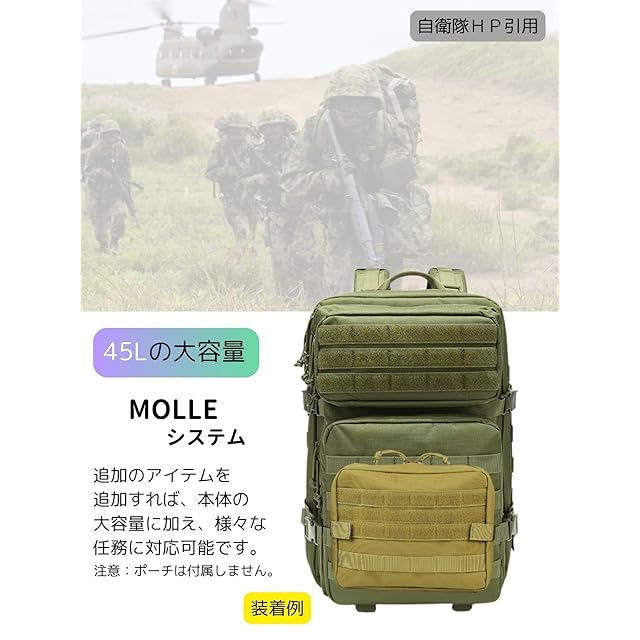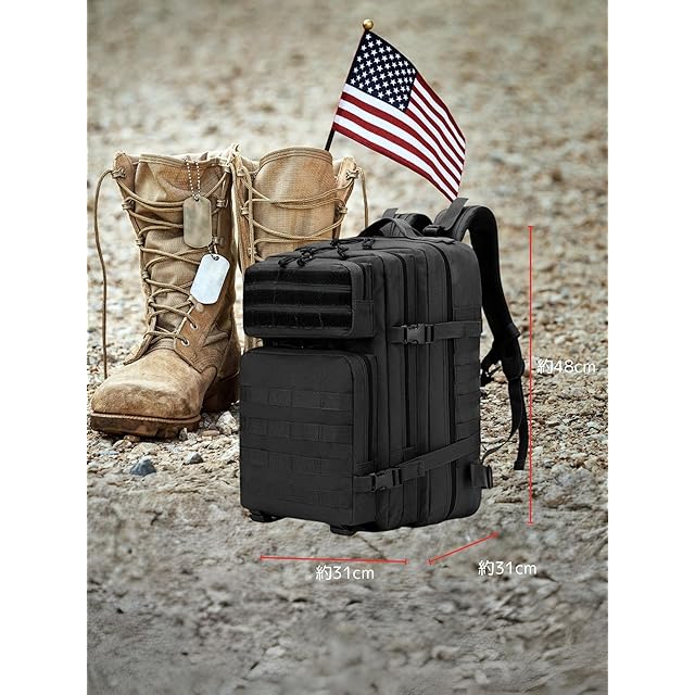 大容量:このタクティカルバックパックは大量の装備、日用品を収容できます。タクティカルバックパックの寸法は約48×約31×約31㎝ (高さ×幅×最大マチ) 重量約1.2㎏で、容量は約45Lです。