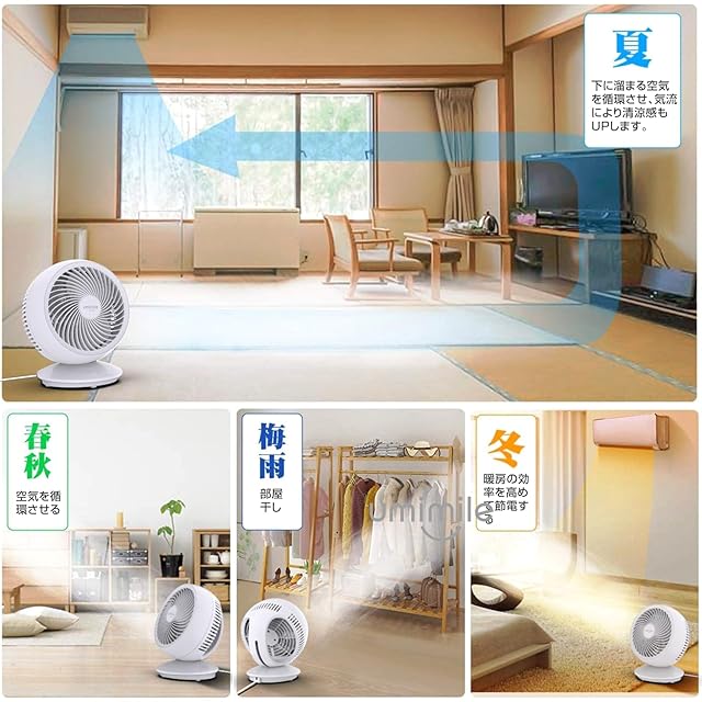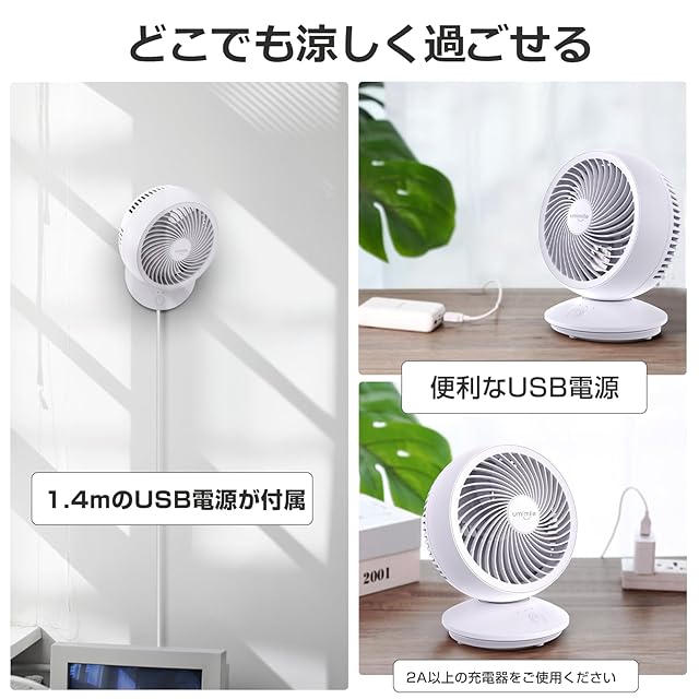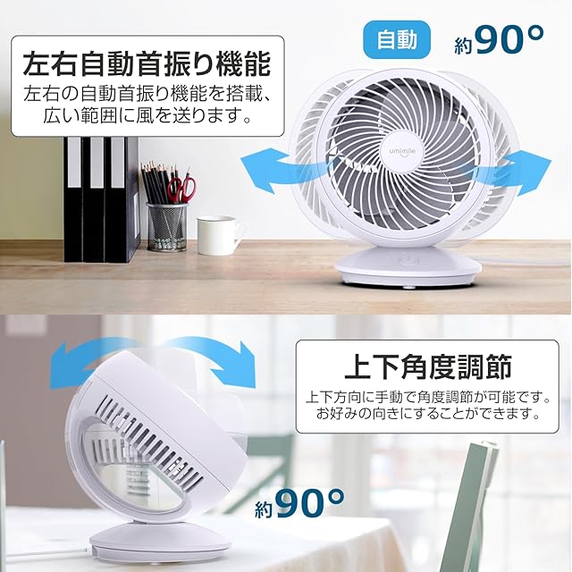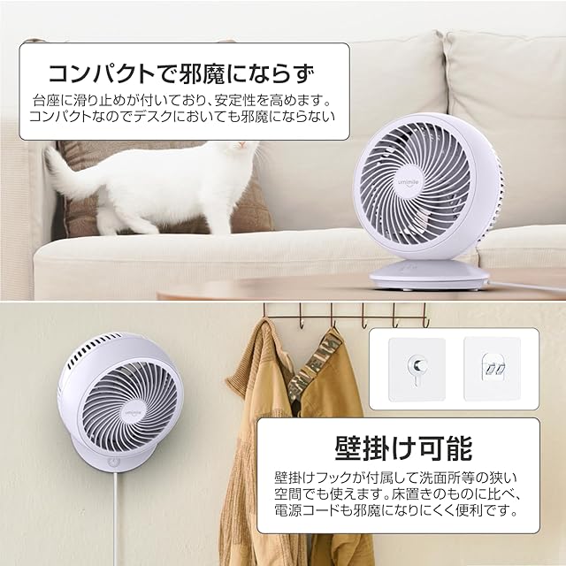 Umimileユミマイル サーキュレーター 首振り 静音 扇風機 壁掛け 羽根径17cm 小型 卓上扇風機 6畳 風量3段階調節 USB電源 ホワイト