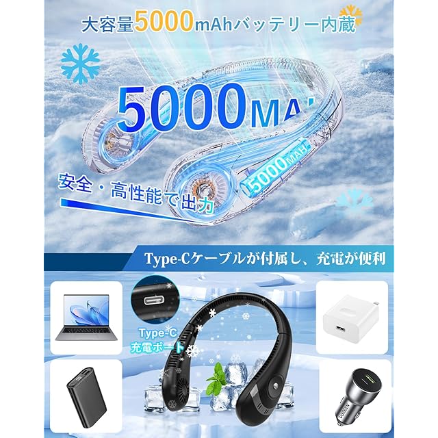 【容量の大型バッテリー 】電力効率は初代モデルより10%アップ、新型力バ-での気流分割デザインと安定なブラシレスモ一タ一を搭載され、羽根がなし、安全性が高、く髪の毛を巻き込まれたり羽根で怪我をしたりする心配はありません。大容量5000mAhのリチウムイオンバッテリ一を内蔵しており、およそ3時間充電で3-18時間の連続送風が可能です。